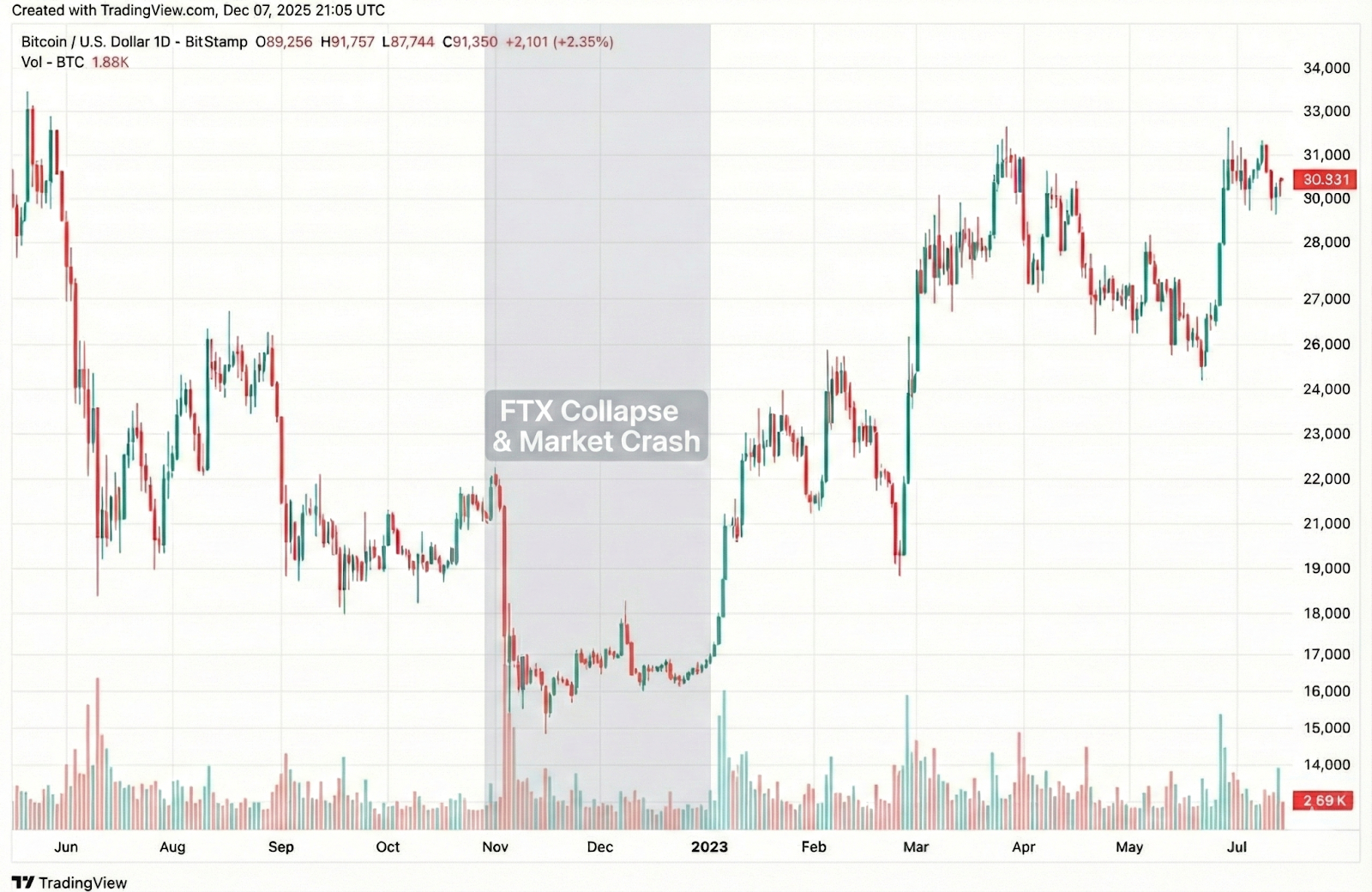 - One of the lowest readings: When FTX blew up in November 2022, BTC briefly flushed into the mid-US$15,000s and major sentiment indices dropped into some of the lowest readings on record (around 12). The index sat in Extreme Fear for several weeks. That was the ‘ok, maybe crypto is really dead’ phase, with constant headlines about fraud, contagion, and missing customer funds (and a lot of layoffs).