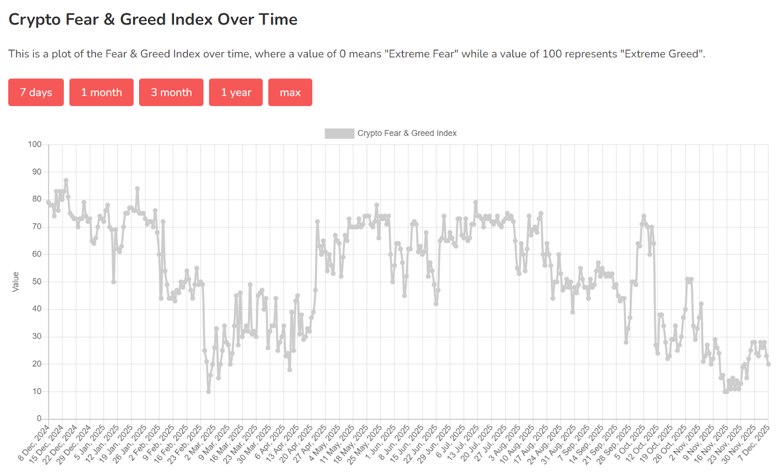 - 0 to 24 means extreme fear, often linked with sharp price drops and signs the market may be oversold.