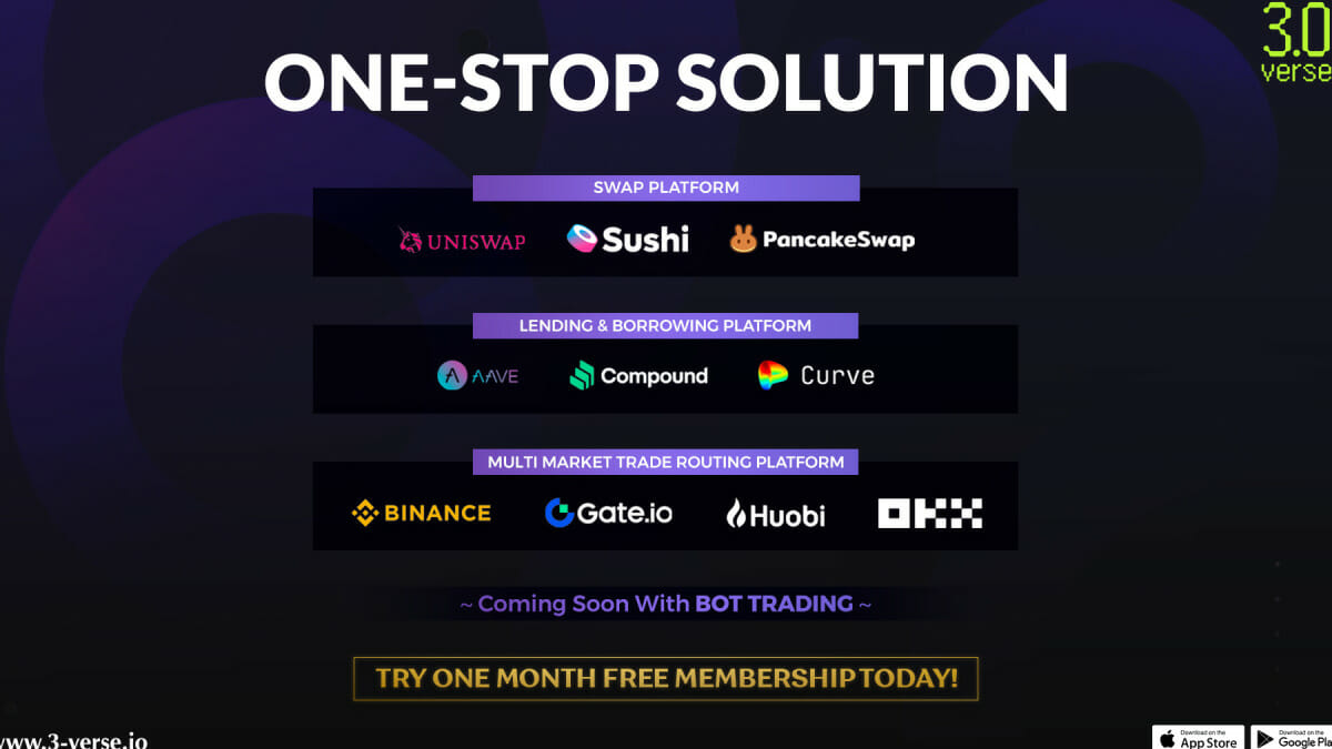 In the dynamic world of large number of trading platforms and cryptocurrencies, the need for an intelligent, information driven and comprehensive user-friendly trade routing platform has never been more crucial. Today, 3.0 Verse is extremely happy to unveil from Dubai, its 3.0 Verse solution, a cutting-edge trade routing platform that brings together the best of both Centralized Finance (CeFi) (Binance, Huobi, Gate IO and OKX) and Decentralized Finance (DeFi) (AAVE, Compound, Curve, Uniswap, Sushi swap and Pancake swap).