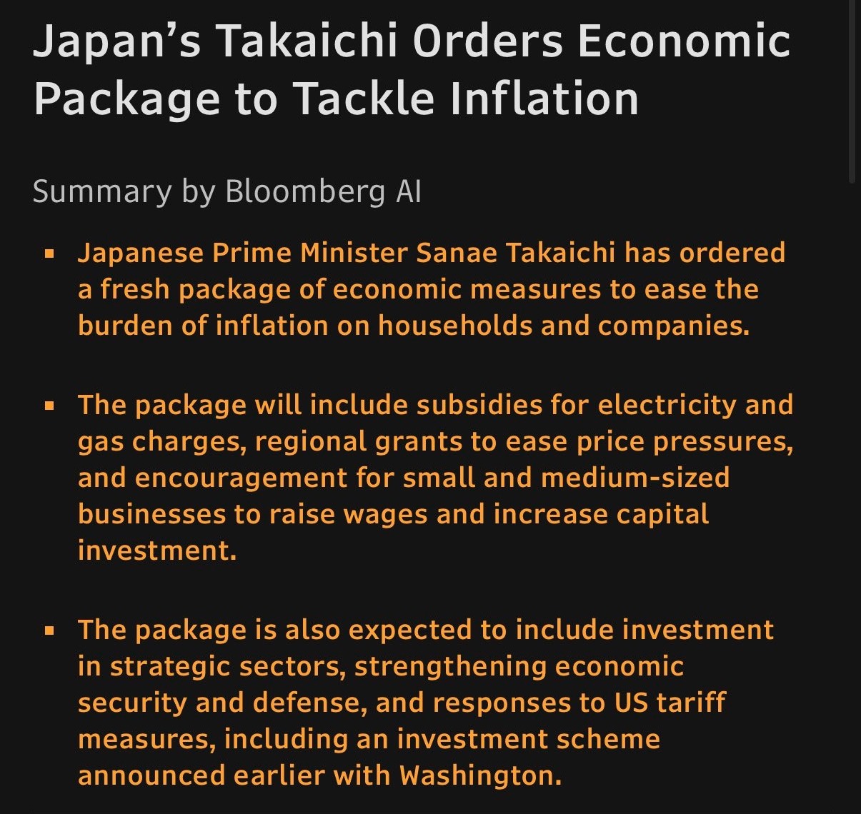 - The plan will reportedly focus on combating inflation but Japan’s newly elected Prime Minister Sanae Takaichi hasn’t released details yet, simply saying it’s in development.