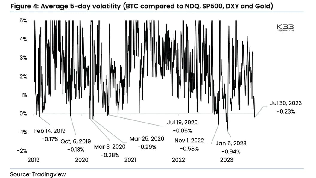 According to digital asset analytics firm K33 Research, bitcoin’s five-day volatility has sunk below that of gold, the Nasdaq 100 and the S&P 500. This only happened a few times in recent years, K33 senior analyst Vetle Lunde pointed out, and every occasion preceded periods of wild price swings.