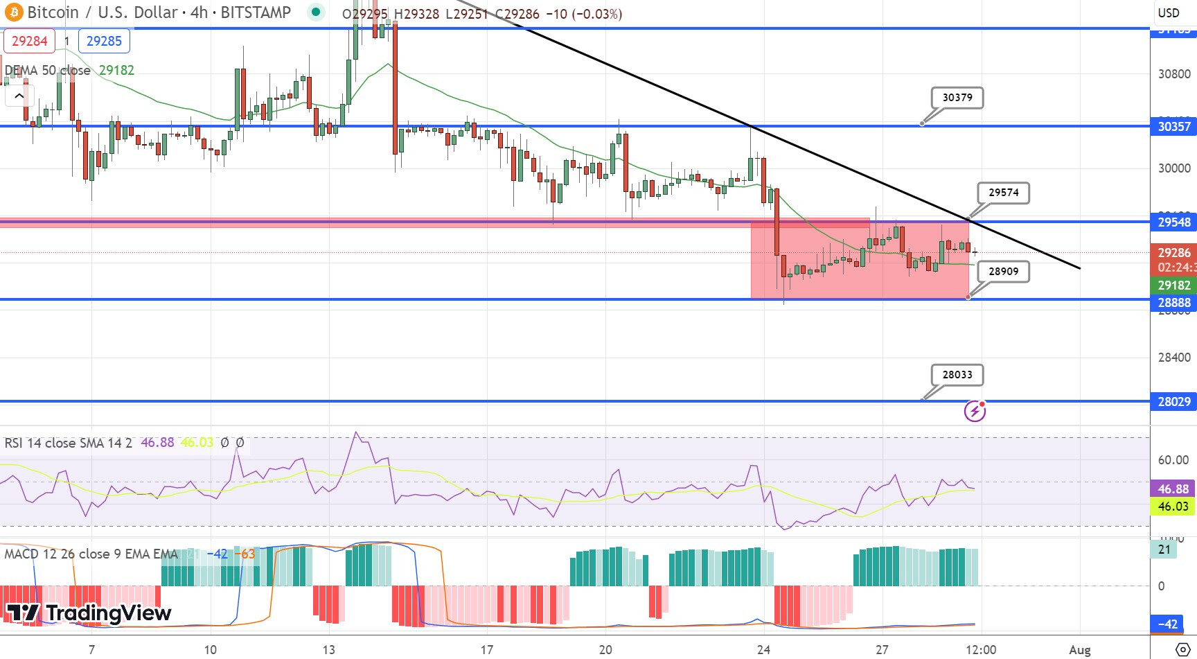 Currently, Bitcoin is positioned slightly under the $29,500 hurdle, which is further reinforced by a downward trend line visible in the four-hour window.