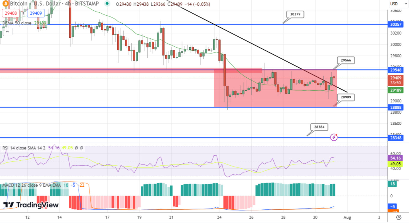 The price movements are anticipated to remain in the range of $29,550 to $28,850, and a breakout above $29,500 might lead to targets around $30,200 or $30,900.