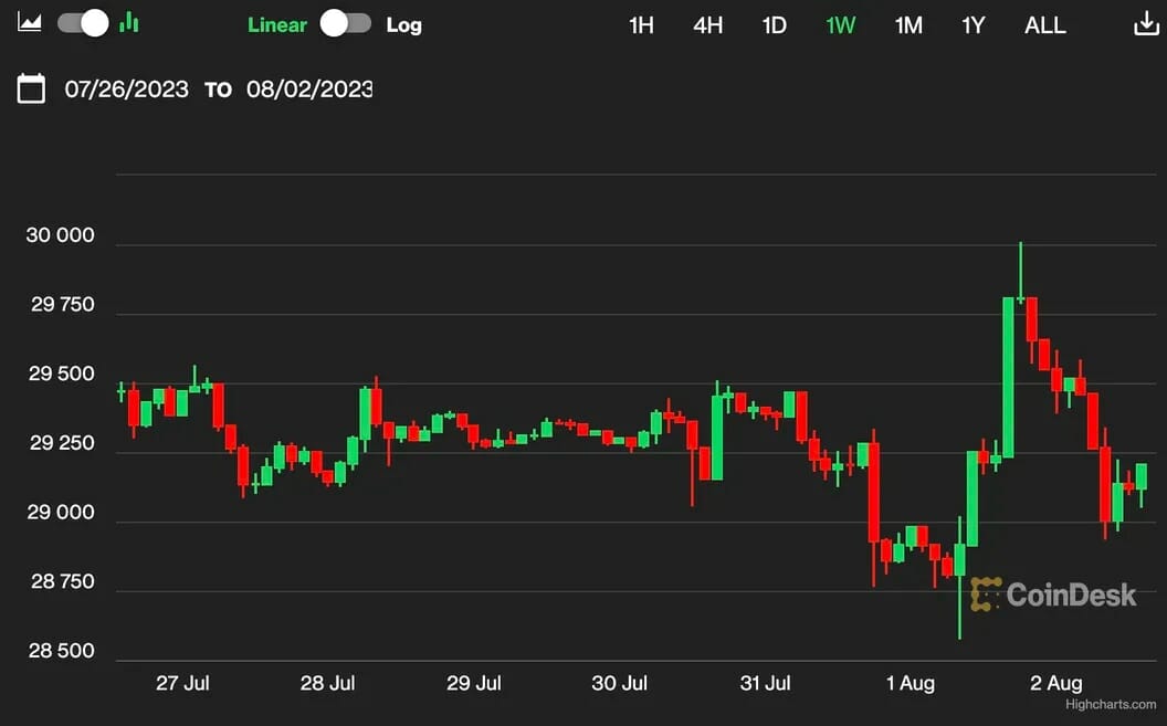 Investors appear to have cast aside industry-specific and macro events that sent BTC’s price surging past $30,000 on Wednesday amid reports of a Fitch downgrade of U.S. Treasurys and MicroStrategy plan to purchase more bitcoin, but then had it plunging below $29,000 after news website Semafor wrote that Binance could face Federal, criminal charges.