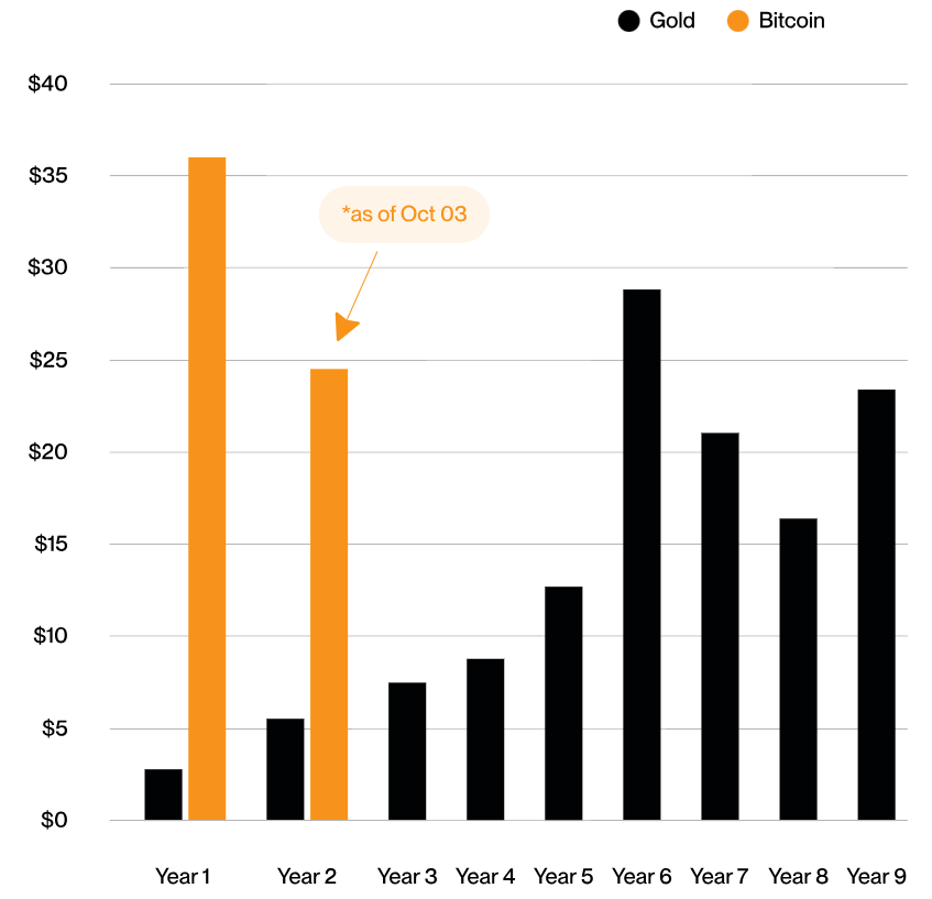 The Bitcoin ETFs have also performed well compared to gold ETFs, as Bitwise’s chart shows. In their first year of trading, BTC ETFs easily outperformed their gold counterparts — and in year two, despite it only being October, they’re already taking the lead again.