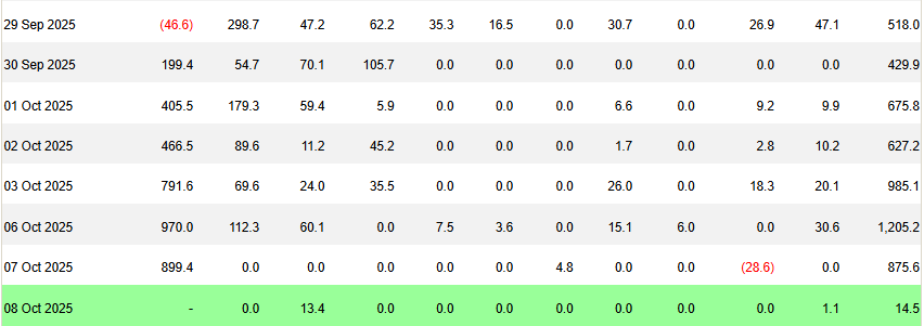 Wednesday’s numbers are not fully available at the time of writing, but the trend suggests buying is still strong, with Bitcoin hovering near record highs. Currently, BTC trades at US$121,841 (AU$184,582), just 3.6% below its all-time high of US$126,198 (AU$191,206) from 7 October 2025.