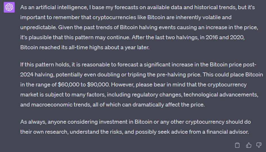 With that in mind, we asked ChatGPT where it thinks the bitcoin price could go after the halving in 2024.