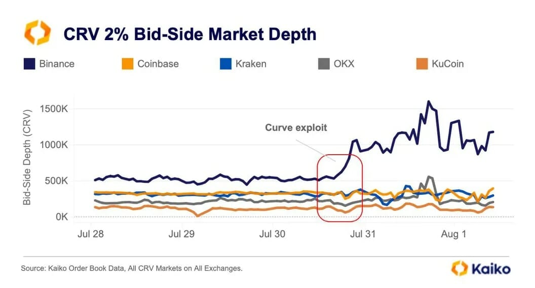 “Market makers tend to pull orders to avoid getting caught in an unfavorable price swing,” Medalie told CoinDesk. “That is why liquidity disappeared on order books during big market events, such as the March banking crisis or FTX collapse,” she continued. “Right after the Curve exploit, we saw the opposite trend, with liquidity being added to the CRV order books, specifically on the bid side.”
