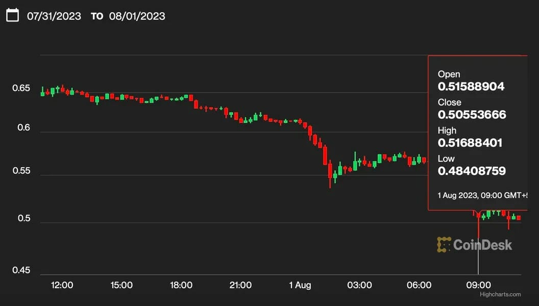 Per Delphi, Egorov has borrowed 63.2 million tether (USDT) from decentralized lender Aave against collateral of 305 million CRV. The position will be liquidated if CRV/USDT pair drops to $0.37.