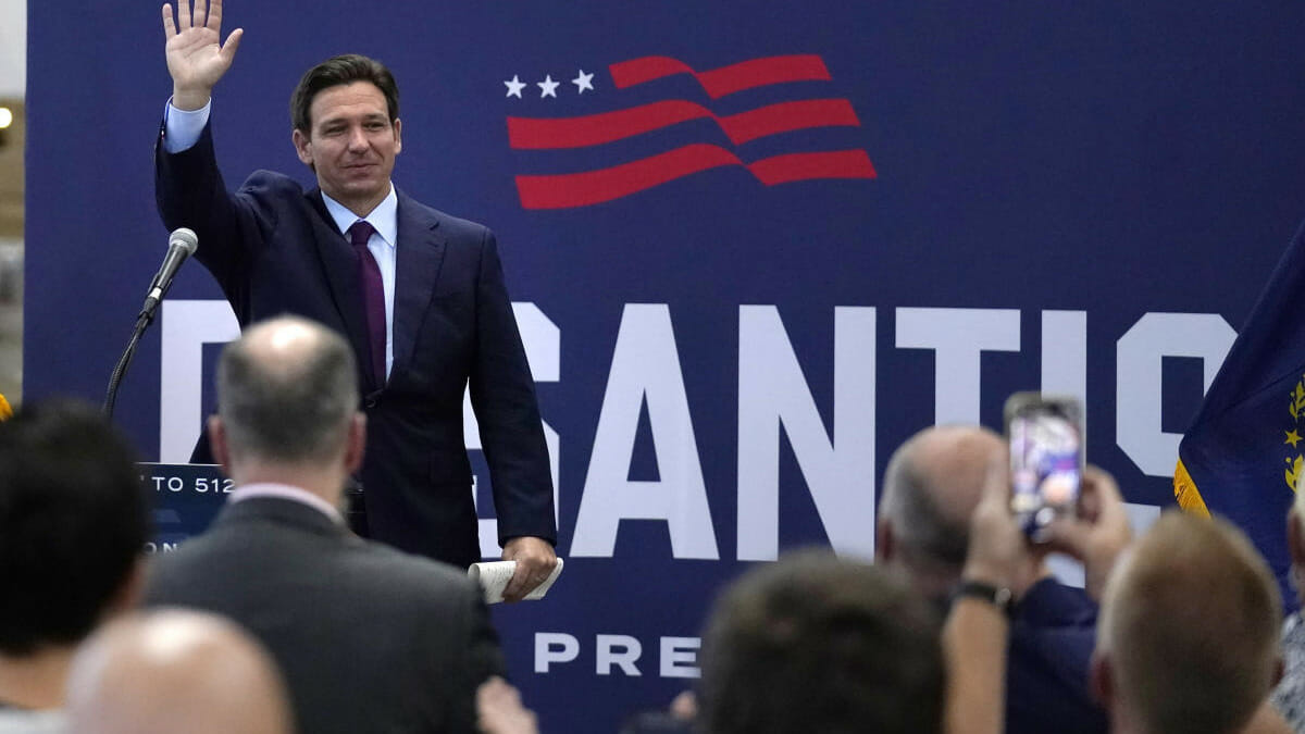 Republican presidential candidate Florida Gov. Ron DeSantis waves to guests during a campaign event to unveil his economic platform on Monday in Rochester, N.H. (AP Photo/Charles Krupa)