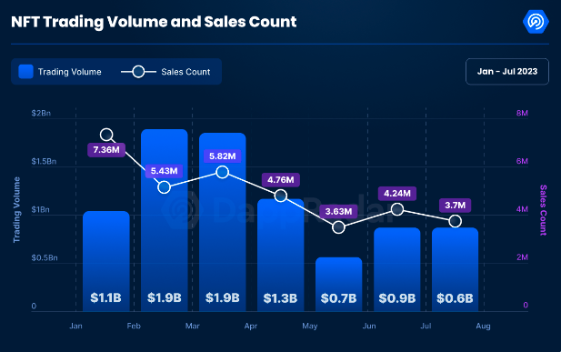 Comparing these numbers to those at the beginning of 2023 puts things into an even worse perspective: In January 2023, there were 7.36 million sales of NFTs, while July netted 3.7 million sales – a 49% drop. Similarly, January saw $1.1 billion in trading volume while July had just $600 million, marking the third straight month trading volume has stayed below a billion dollars.