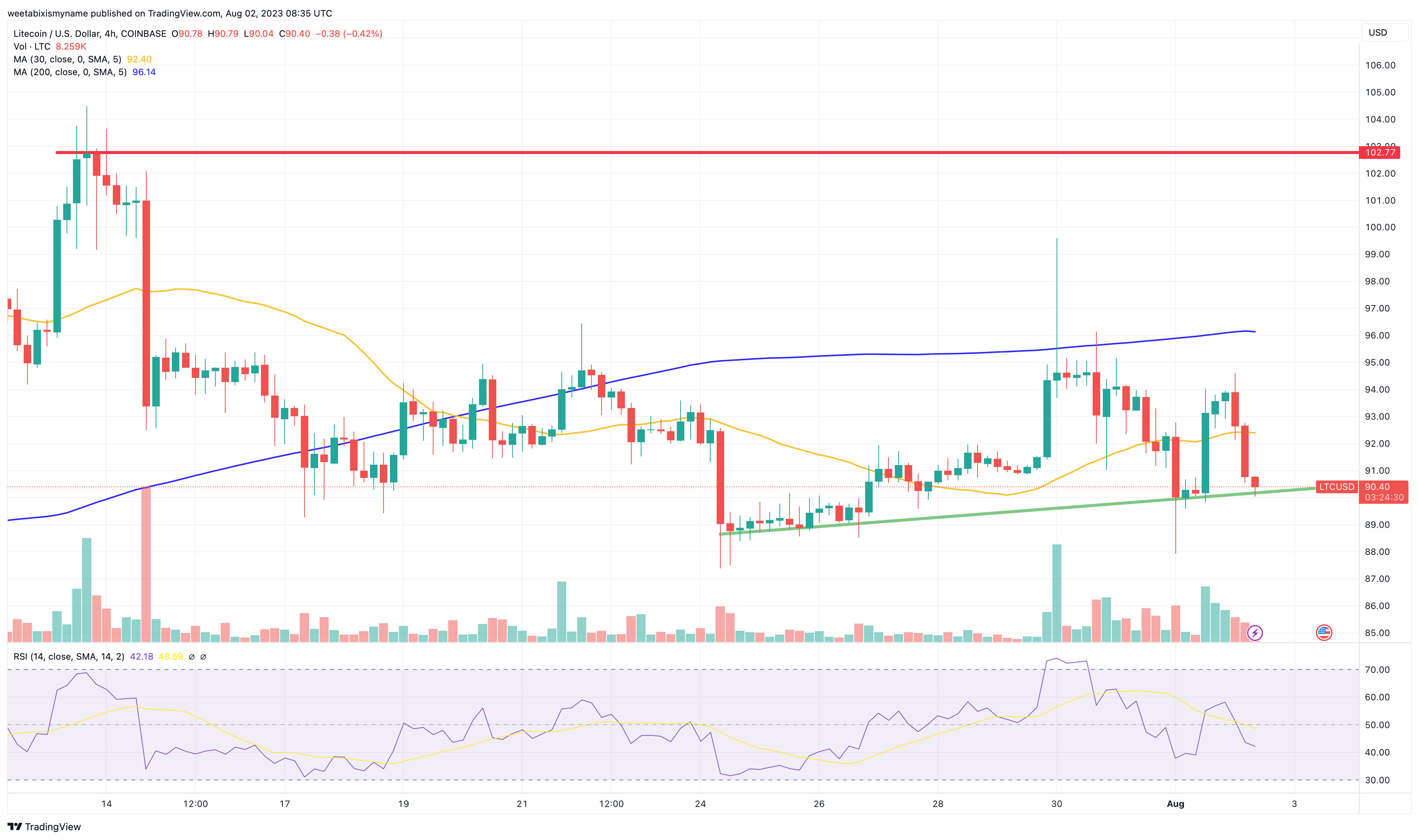 The Litecoin price has barely moved in the past 24 hours, sticking to the $90 level as the cryptocurrency awaits its latest halving event today.