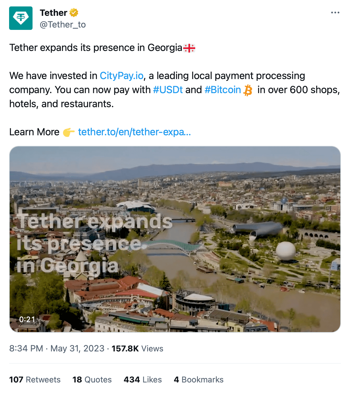 At the same time, Tether spread its wings into the payment processing arena via CityPay.io in Georgia.