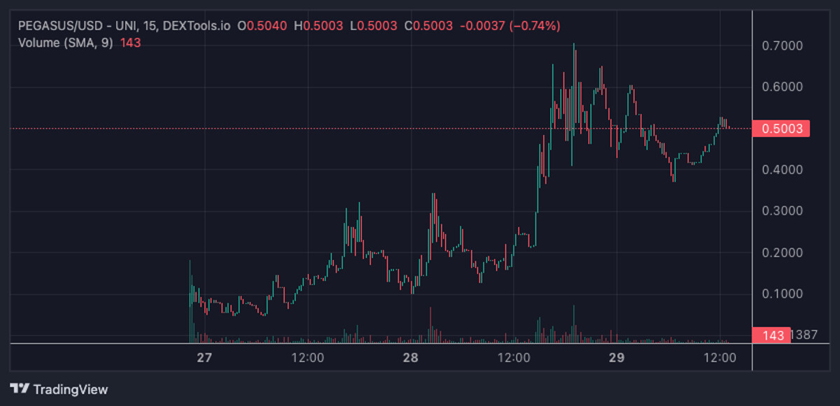 The digital asset previously locked in a 1,000% profit in the past day, hitting a record high of $0.7048. Now, PEGASUS is consolidating its gains but still showing strong bullish signals.