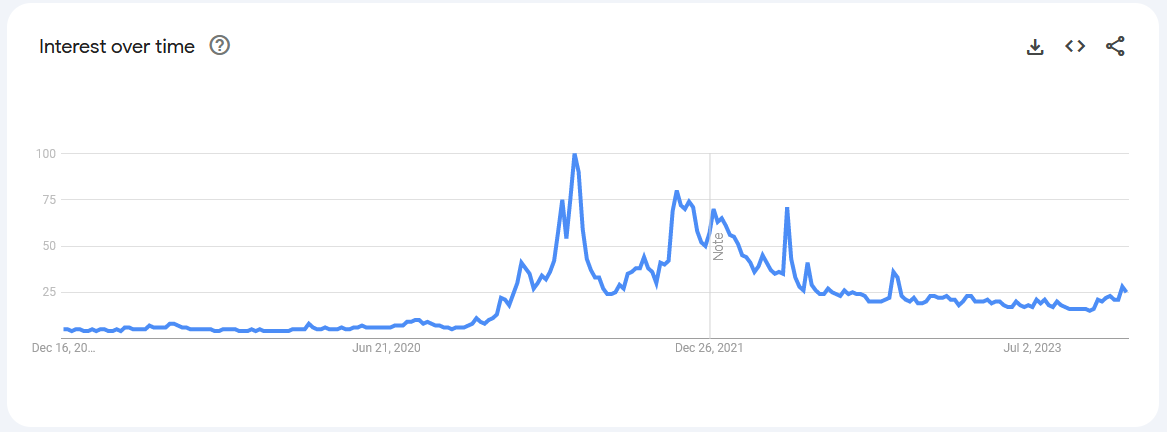 Retail trading volume has remained low, although overall movement on exchanges has started to pick up in the final quarter of 2023. To reiterate the lack of retail interest, we just need to look at Coinbase’s ranking in the smartphone app stores. It currently sits at #24 for finance apps – higher than its all-time low of #28 in September, but significantly below its peak of #1 in October 2021. On top of this, search rankings for “crypto” on Google are still 50% lower than the 2022 average, even though the market has performed much better over the past 12 months.