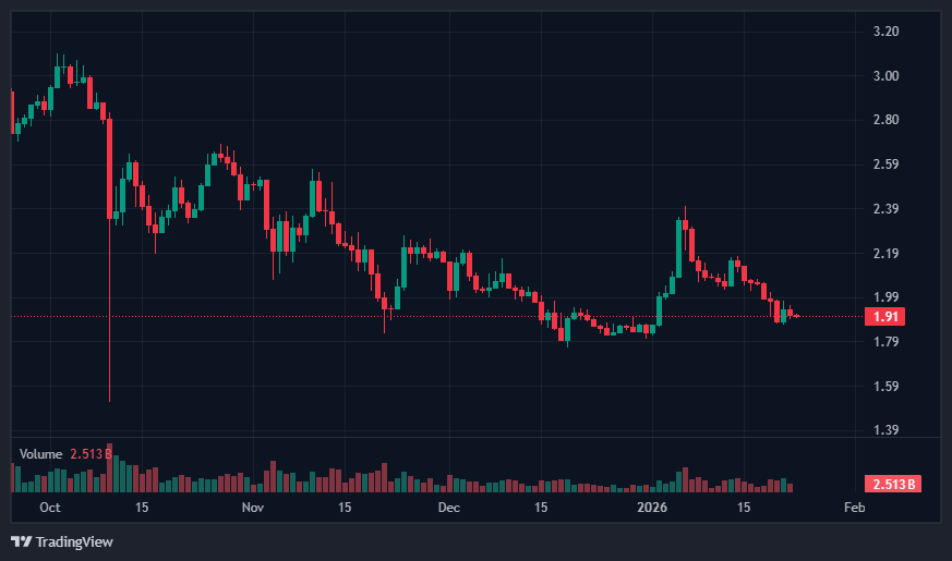 XRP has fallen since its July 2025 record of US$3.65 (AU$5.58). It bounced in early January and nearly hit US$2.40 (AU$3.67) but lost momentum. It now trades about 47% below the peak, with broader market uncertainty adding pressure.