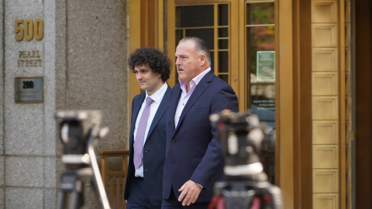 Sam Bankman-Fried (left) exits a courthouse after a hearing on July 26, 2023. (Nikhilesh De/CoinDesk)