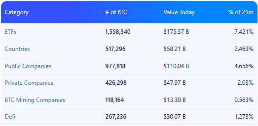 Despite these outflows, US spot Bitcoin ETFs remain the fastest-growing ETFs in history. Combined, they now hold a larger share of BTC than Saylor’s Strategy, with ETFs globally accounting for about 7.4% of all Bitcoin.
