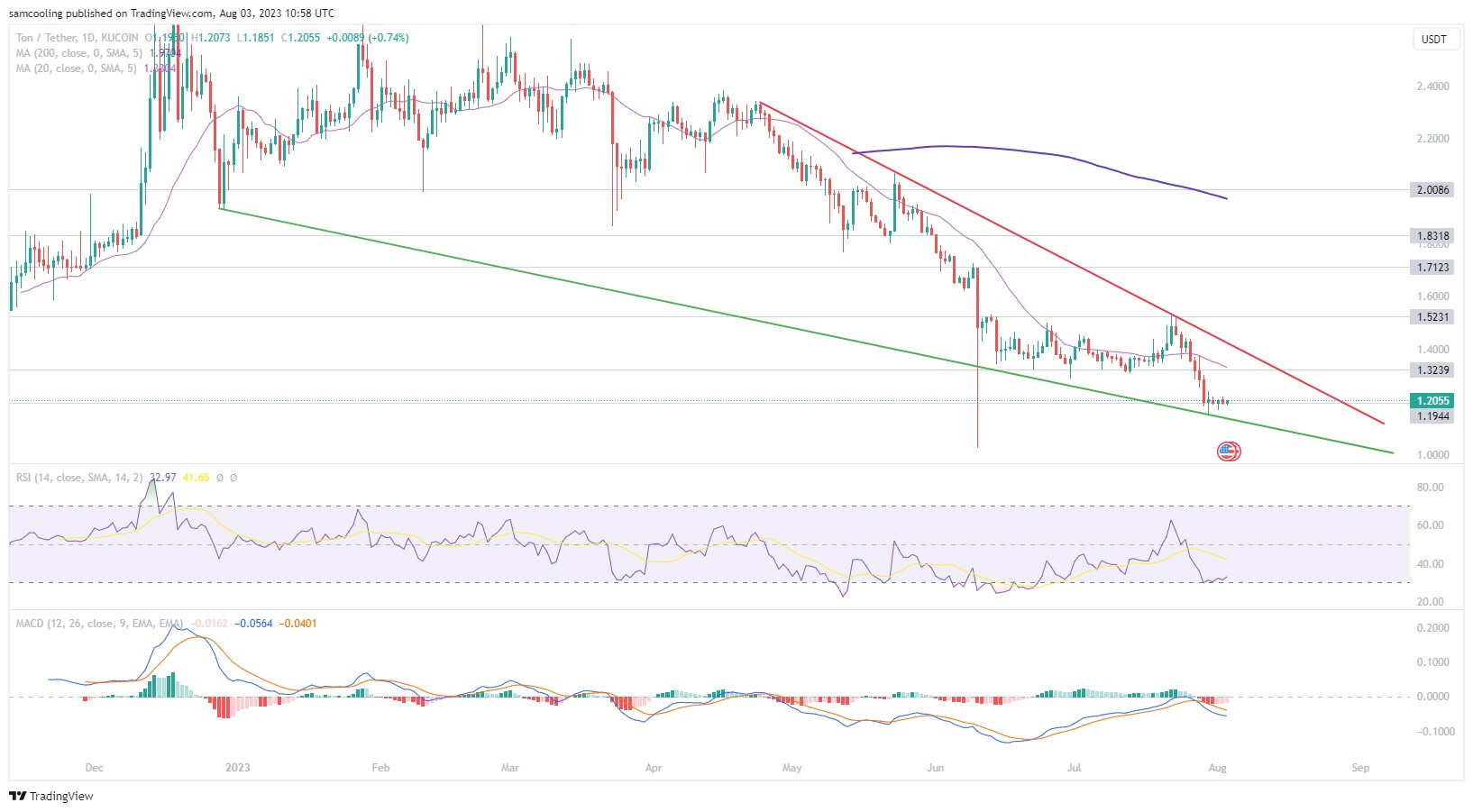 Caught in a tight trading channel, Toncoin’s technical unravelling has left price trading low at a current price of $1.20 (a 24-hour change of +0.64%).