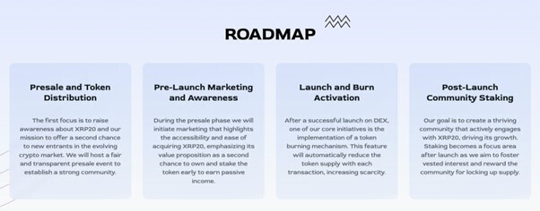 The XRP20 presale serves as an inviting opportunity for early adoption, the project’s roadmap highlights a focus on marketing and awareness, followed by a token burning mechanism and community staking.