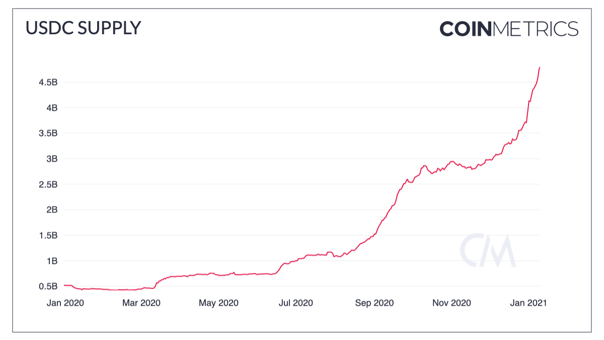 A recent stats report by Coin Metrics, shows USD Coin (USDC) supply reaching US $5 Billion, rising from just 500 Million since last year.