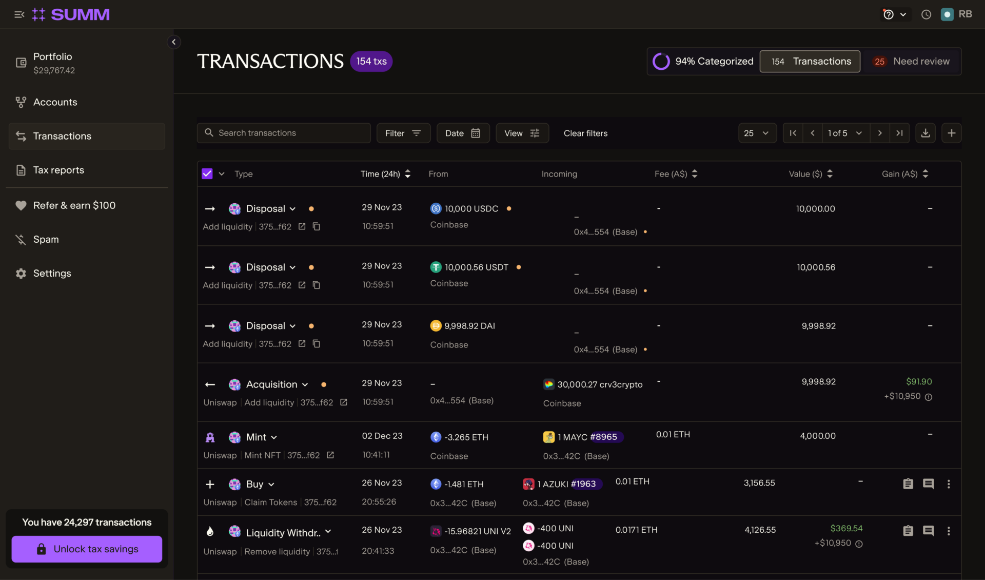 Once everything is connected, your transactions should automatically be sorted – including exchange purchases, DeFi activity and NFT sales. Now, it’s a matter of reviewing each transfer to ensure the data is correct and nothing is missing.