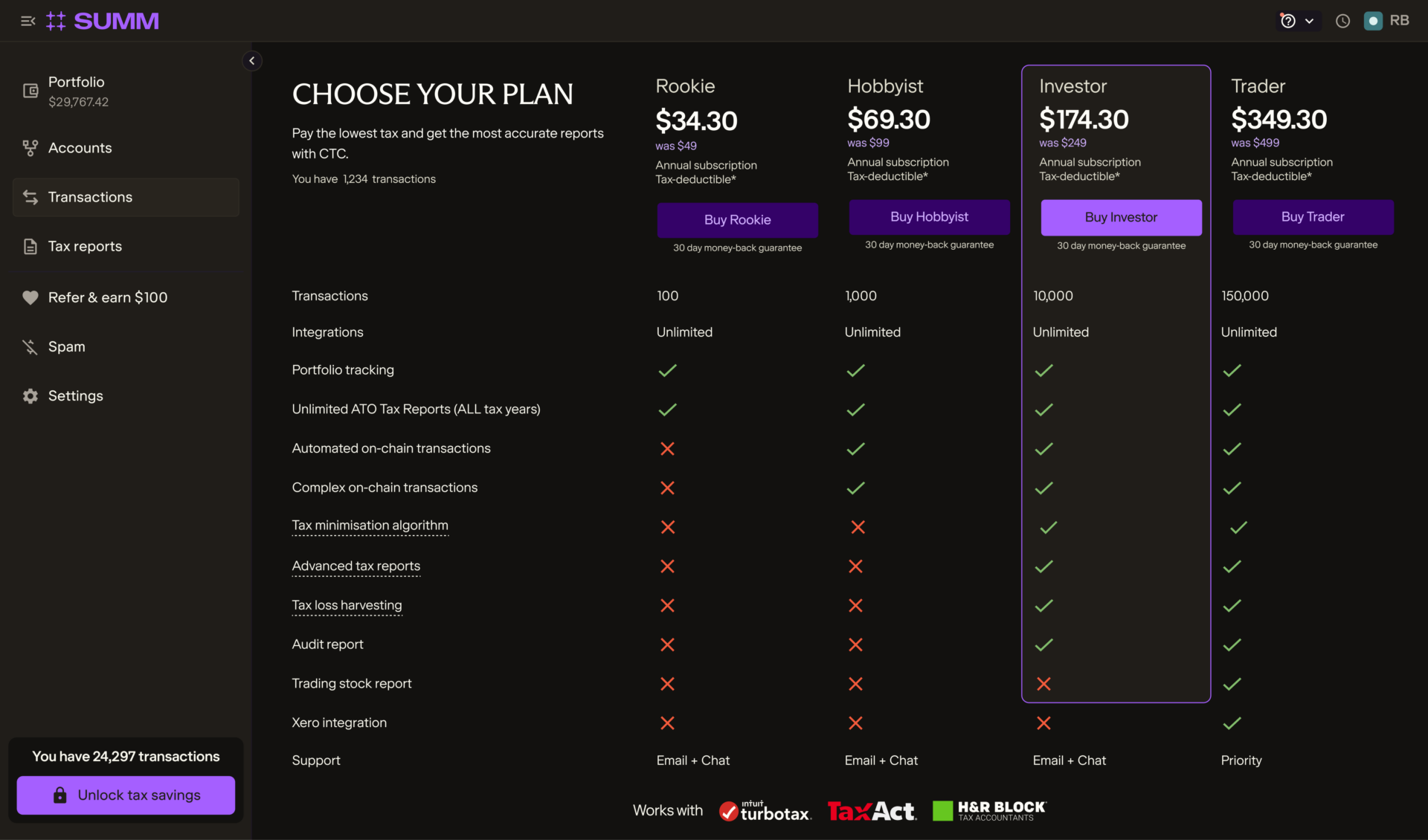 The Rookie plan is perfect for small-time investors, supporting up to 100 transactions, unlimited integrations and unlimited ATO reports.